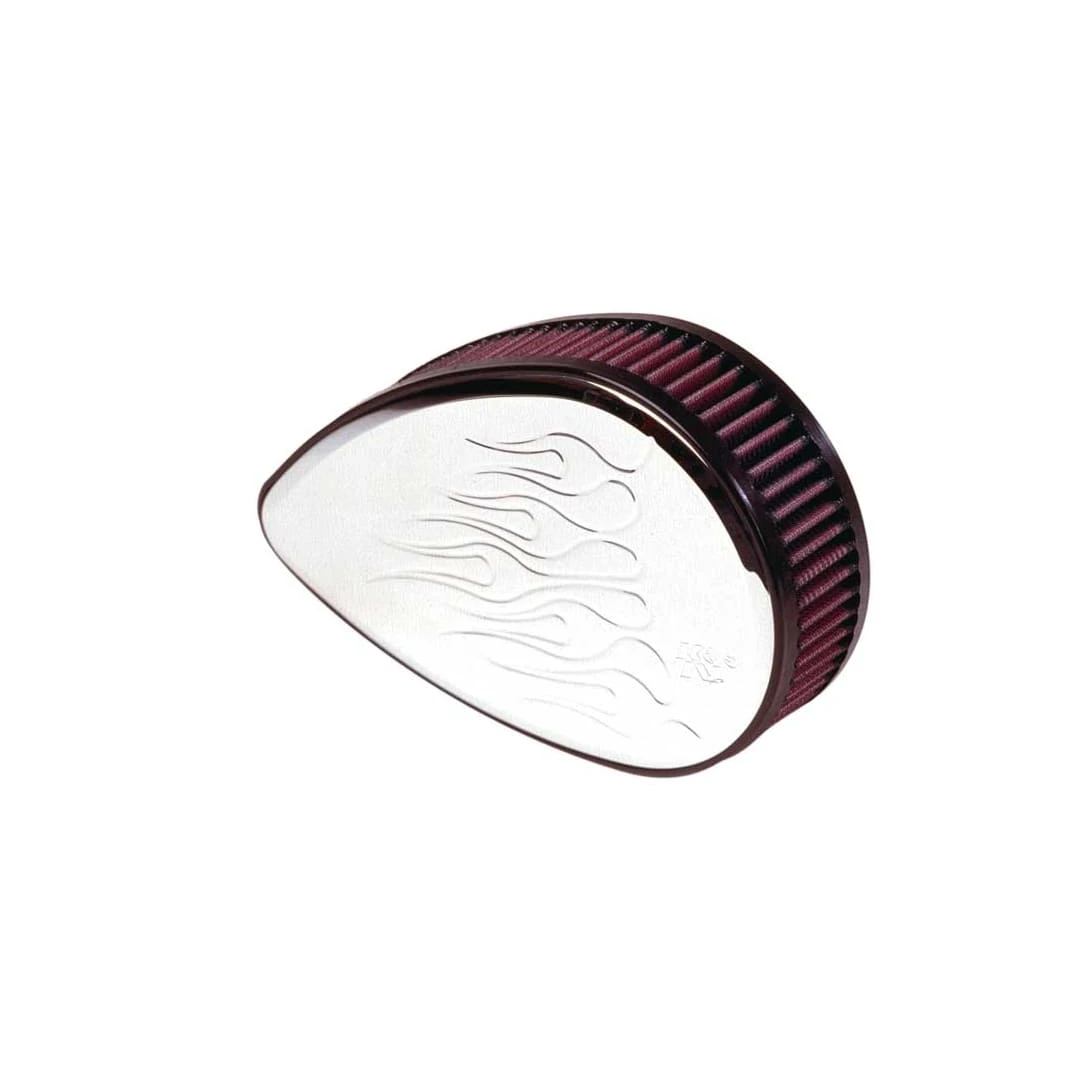 K&N air cleaner assemblies, designed for your Harley-Davidson, are a remarkable combination of performance and style. These air cleaner assemblies are made to increase horsepower and torque by supplying superior air flow. They are machined from billet aluminum, luster polished, then chrome plated to complement your show bike. This K&N custom air cleaner fits select Sportster models. Each K&N air cleaner comes complete and ready to use including, a mounting bracket kit. There’s nothing else to buy. Installation is easy, so exceptional performance is only a few steps away with a K&N custom air cleaner. Not only that, but these parts are designed for optimal looks. This teardrop-shaped chrome covered is graced by a vintage flame design.