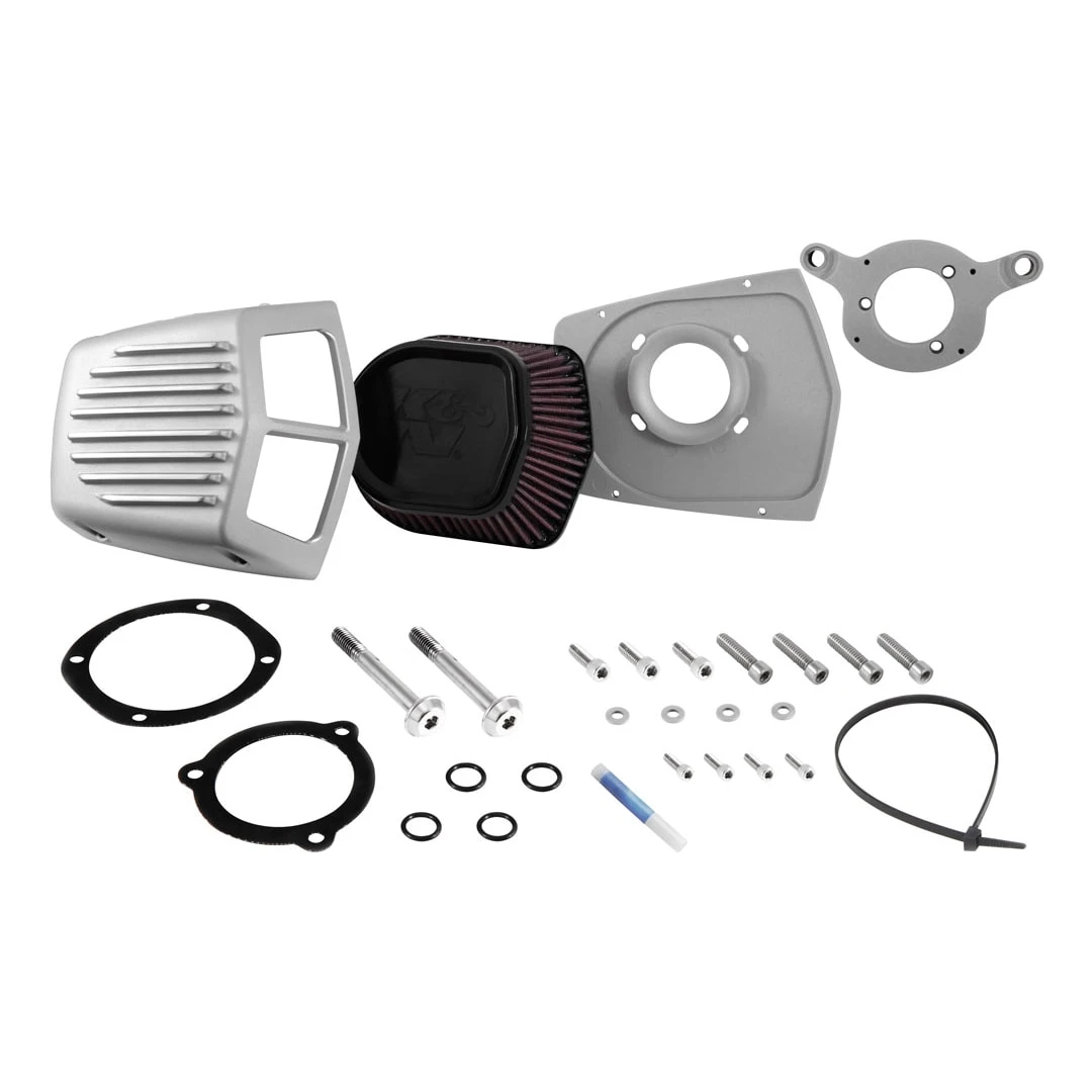 K&N Street Metal Air Intake Systems for Harley Davidson® motorcycles replace the restrictive stock OE air cleaner with an oversized K&N High-Flow Air Filter and a high-volume cast aluminum housing. If you’re looking for an aggressive appearance but want a significant increase in airflow, resulting in more power, this high-flow air intake system is exactly what your Harley needs. Installation is so simple, it can usually be done in 90 minutes or less. The K&N air filter is washable, reusable, pre-oiled and ready for installation. This intake system features a matte silver housing with polished fins. Internal breathers provide a sleek, clean appearance. This air intake has classic styling with a savage appeal.