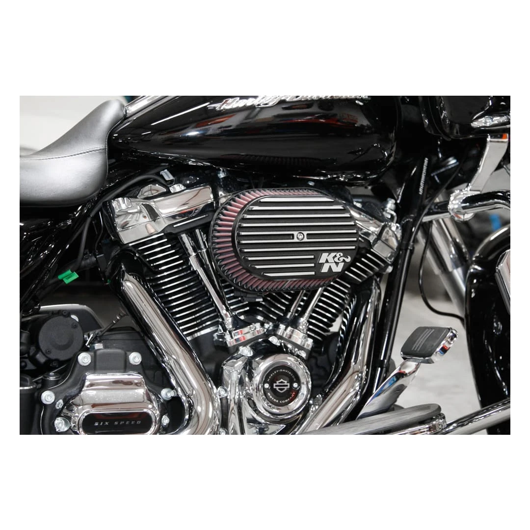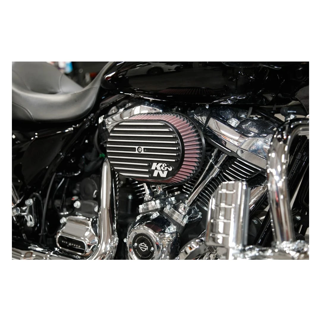 K&N Street Metal Air Intake Systems for Harley Davidson® motorcycles replace the restrictive stock OE air cleaner with an oversized K&N High-Flow Air Filter and a high-volume cast aluminum housing. If you’re looking for an aggressive appearance but want a significant increase in airflow, resulting in more power, this high-flow air intake system is exactly what your Harley needs. Installation is so simple, it can usually be done in 90 minutes or less. The K&N air filter is washable, reusable, pre-oiled and ready for installation. This intake system features an updated, modern look with an oval-shaped matte black housing. Silver details and sanded fins further enhance the streamlined look. Internal breathers provide a sleek, clean appearance. This air intake has a classic styling with a savage appeal. These K&N air intakes are street legal in most states. They are not legal for use in California and other states adopting California emission standards.